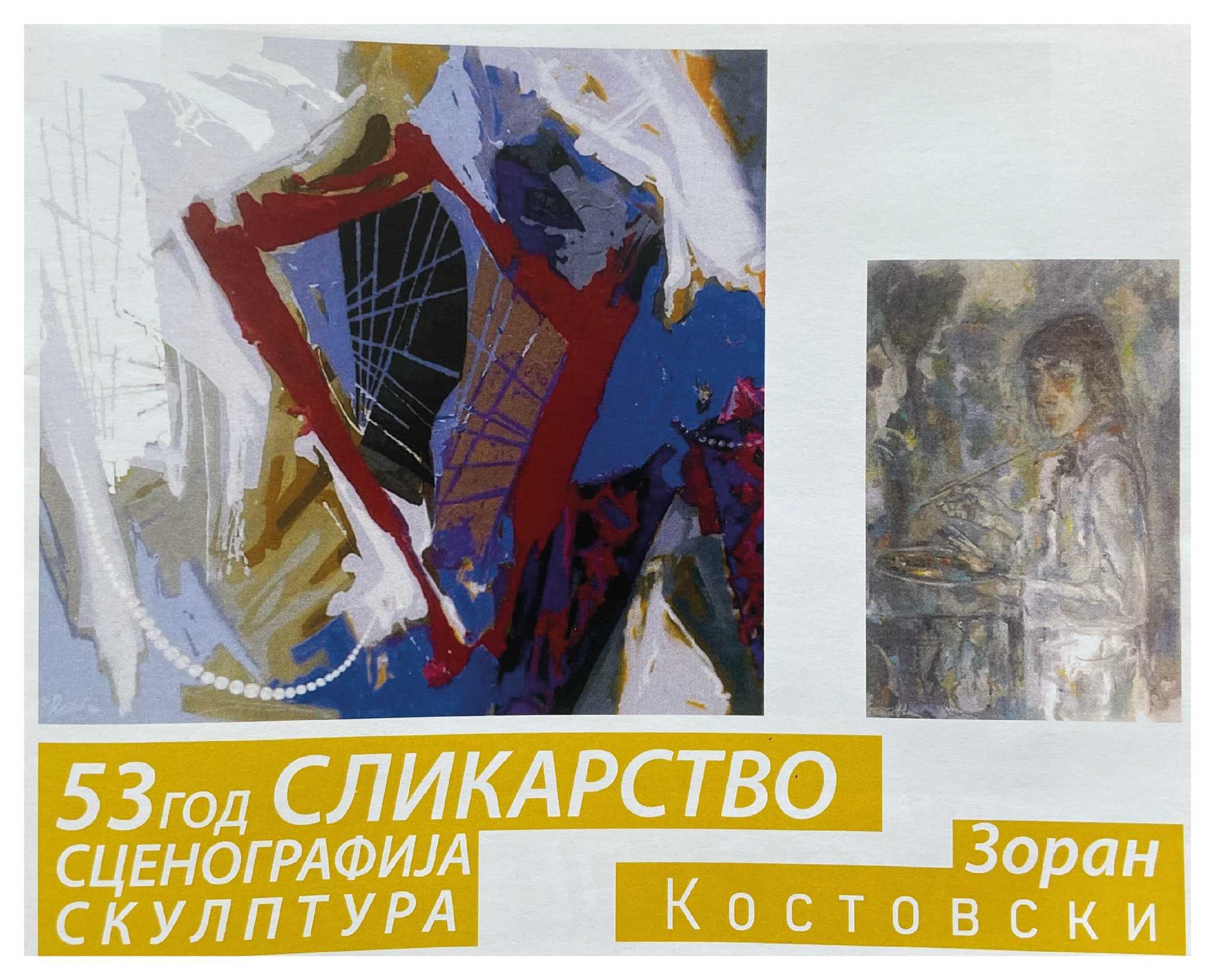 Во Националната галерија на Македонија, објект „Мала станица“ во Скопје, утре (вторник) со почеток во 19:30 часот, ќе биде отворена изложбата на македонскиот уметник Зоран Костовски, насловена „53 години сликарство, сценогарфија и скулптура“ .