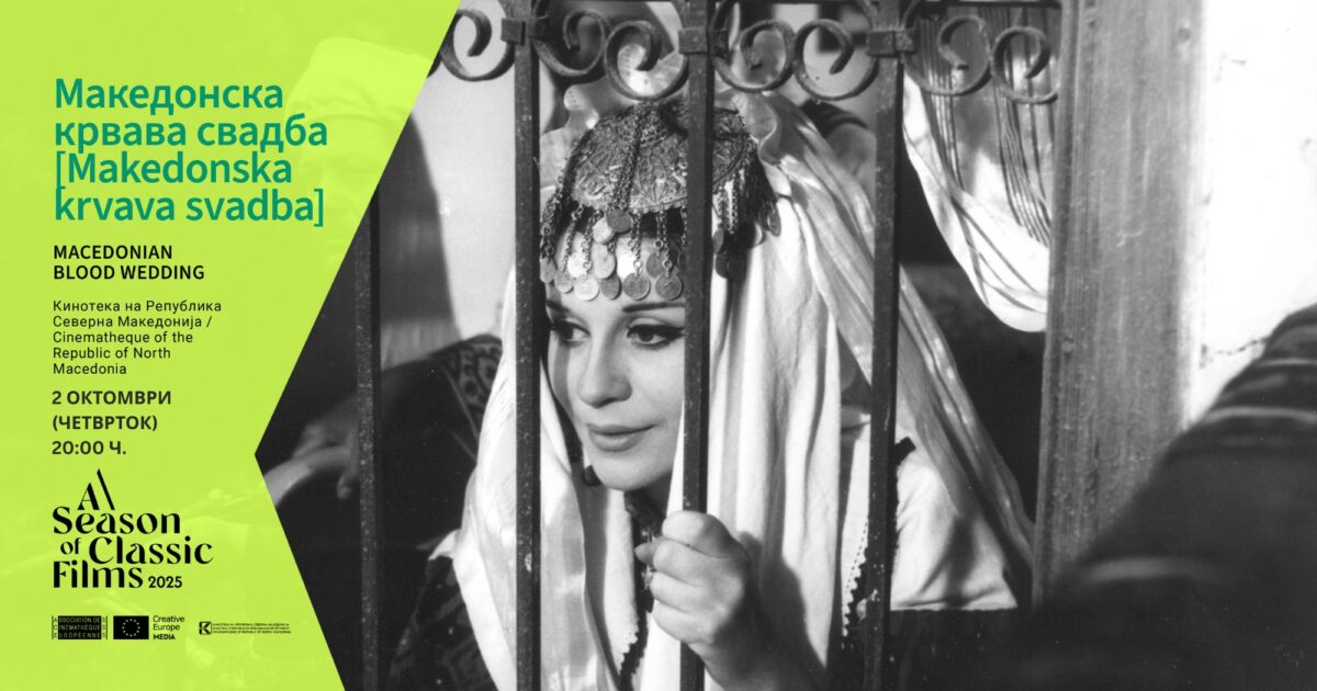 На 2 октомври во 20:00 часот во киносалата на Кинотеката ќе се одржи специјална проекција на дигитално реставрираниот филм „Македонска крвава свадба“ (1967, режија: Трајче Попов), како дел од проектот „Сезона на филмски класици“.