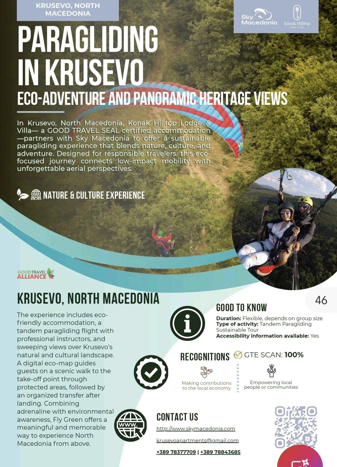 Препознаената понуда, наречена „Fly Green“, претставува иновативна и одржлива параглајдинг-тура која комбинира природа, култура и адреналин. Таа вклучува сместување во еколошки сертифицирани капацитети, сценски прошетки низ природата со едукативен аспект, гастрономско искуство со локални специјалитети од одржливи извори, како и тандем-летови со лиценцирани пилоти над Крушево, придружени со стручно објаснување и претставување на културно-историското богатство.