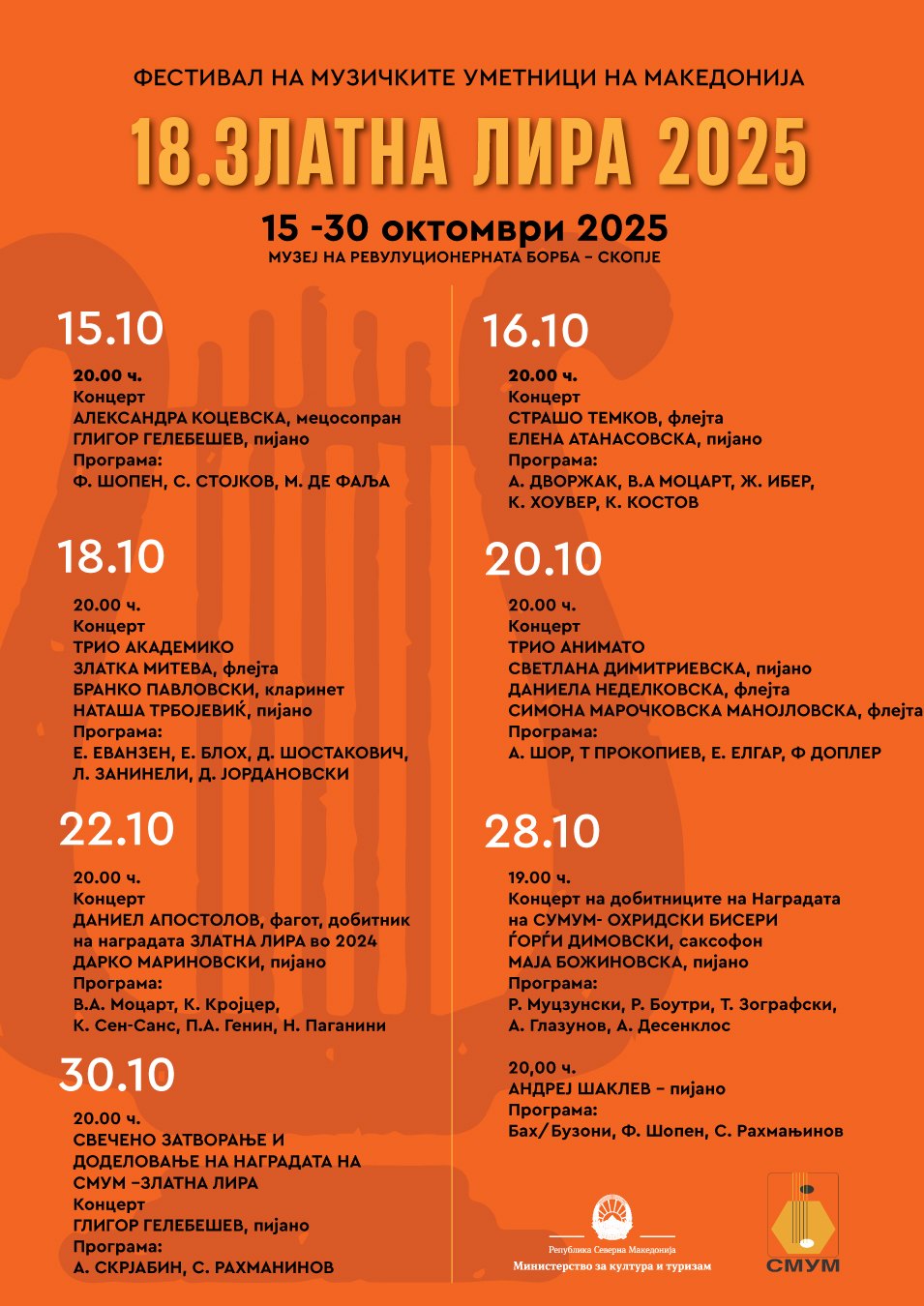 Од денеска до 30 октомври ќе се одржи 18. издание на Фестивалот на камерна музика „Златна лира“, кој е во организација на Сојузот на музичките уметници на Македонија (СМУМ). Во рамките на годинашното издание, публиката ќе има можност да присуствува на седум камерни концерти, на кои ќе настапат реномирани македонски музичари што го градат својот уметнички пат во земјава и во странство.