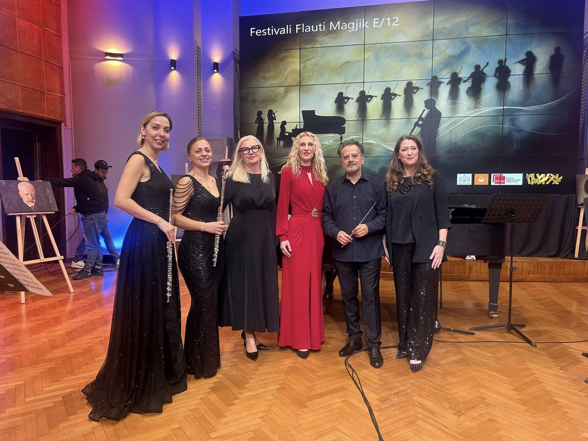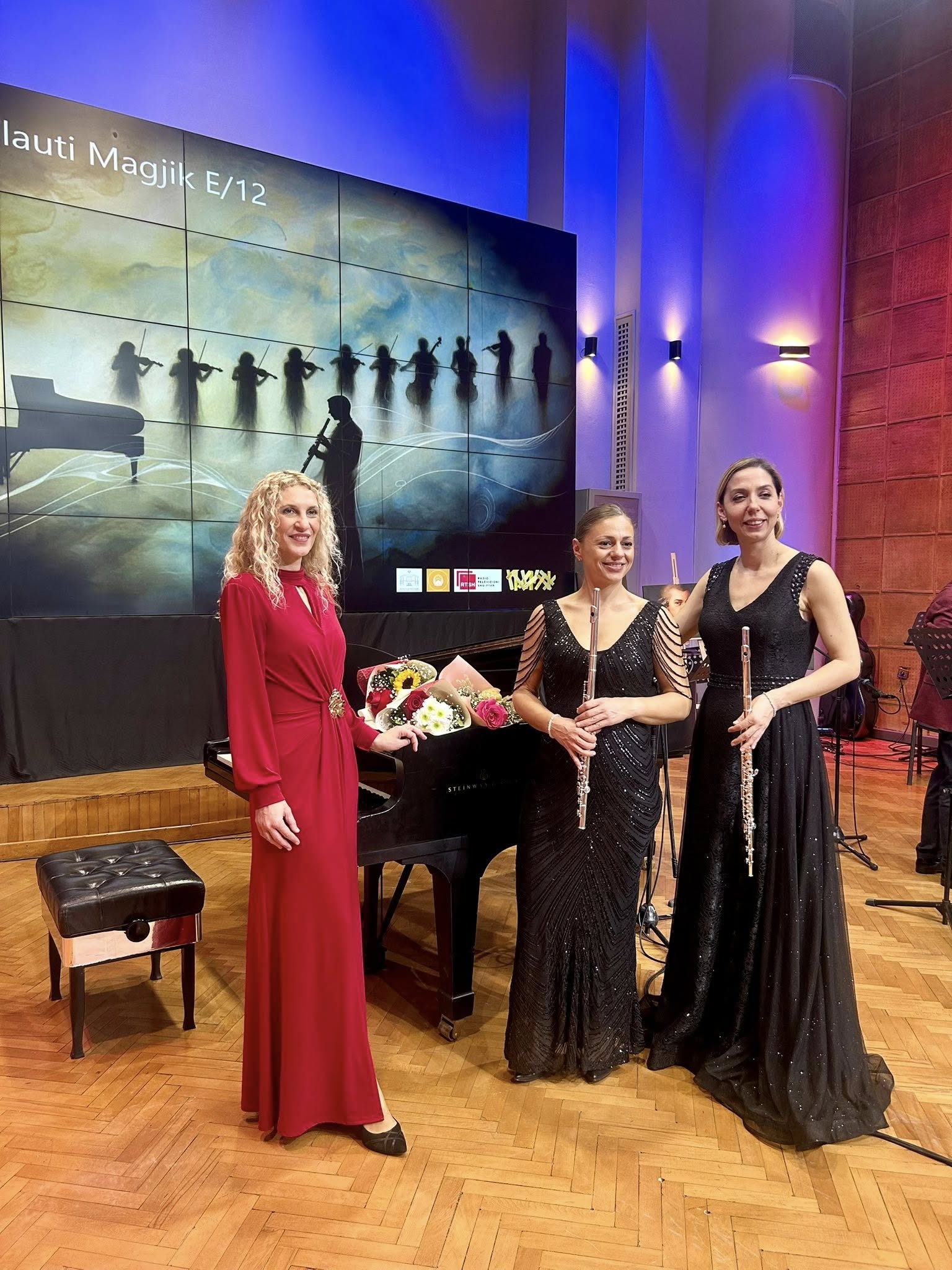 Триото го сочинуваат двете флејтистки Даниела Неделковска и Симона Марочковска Манојловска и пијанистката Светлана Димитриевска. Во вториот дел од концертот следуваше изведба на оркестарот на РТШ со кларинетистот Роланд Бербиу, под диригентство на Фатос Керимај.